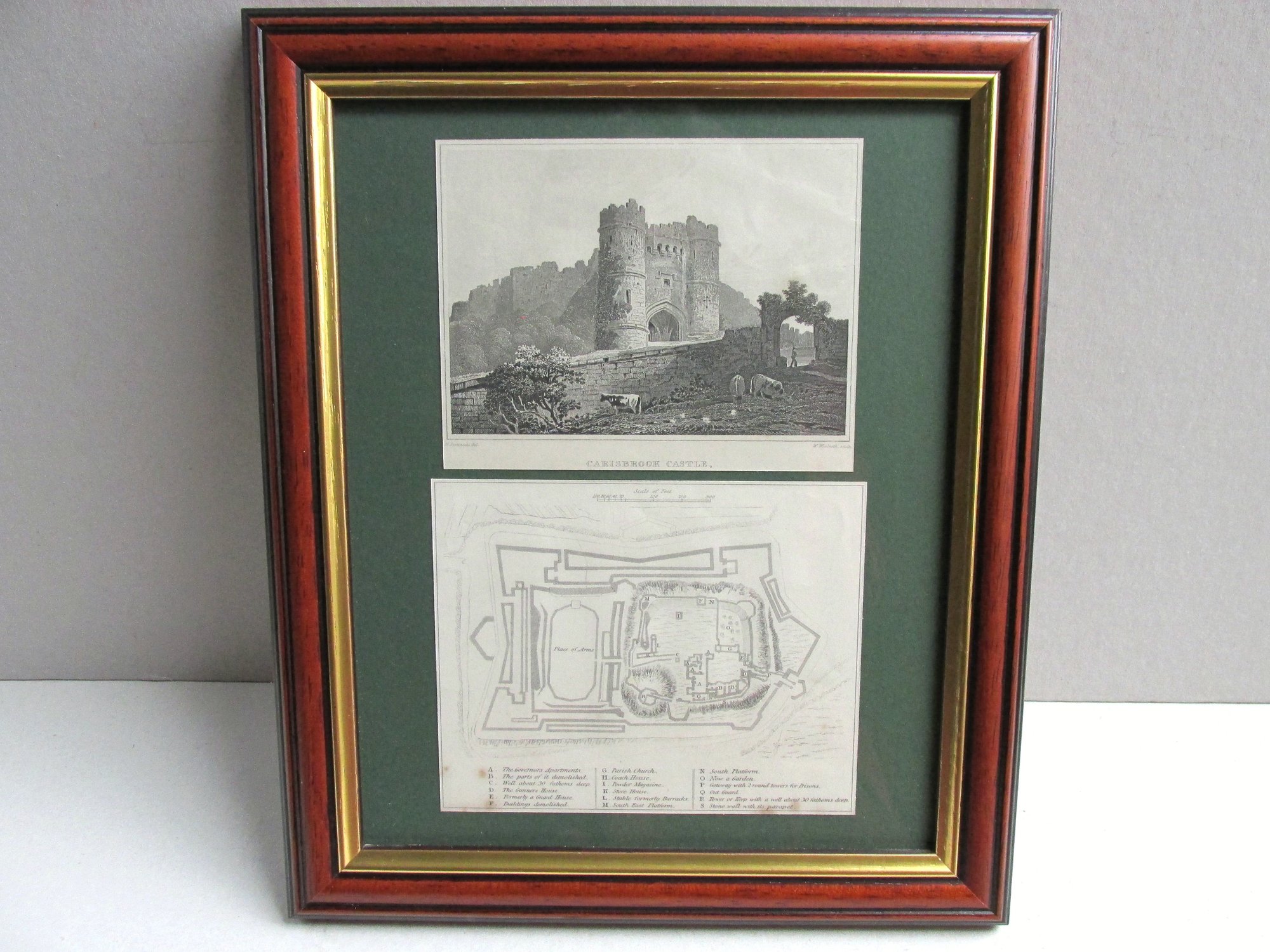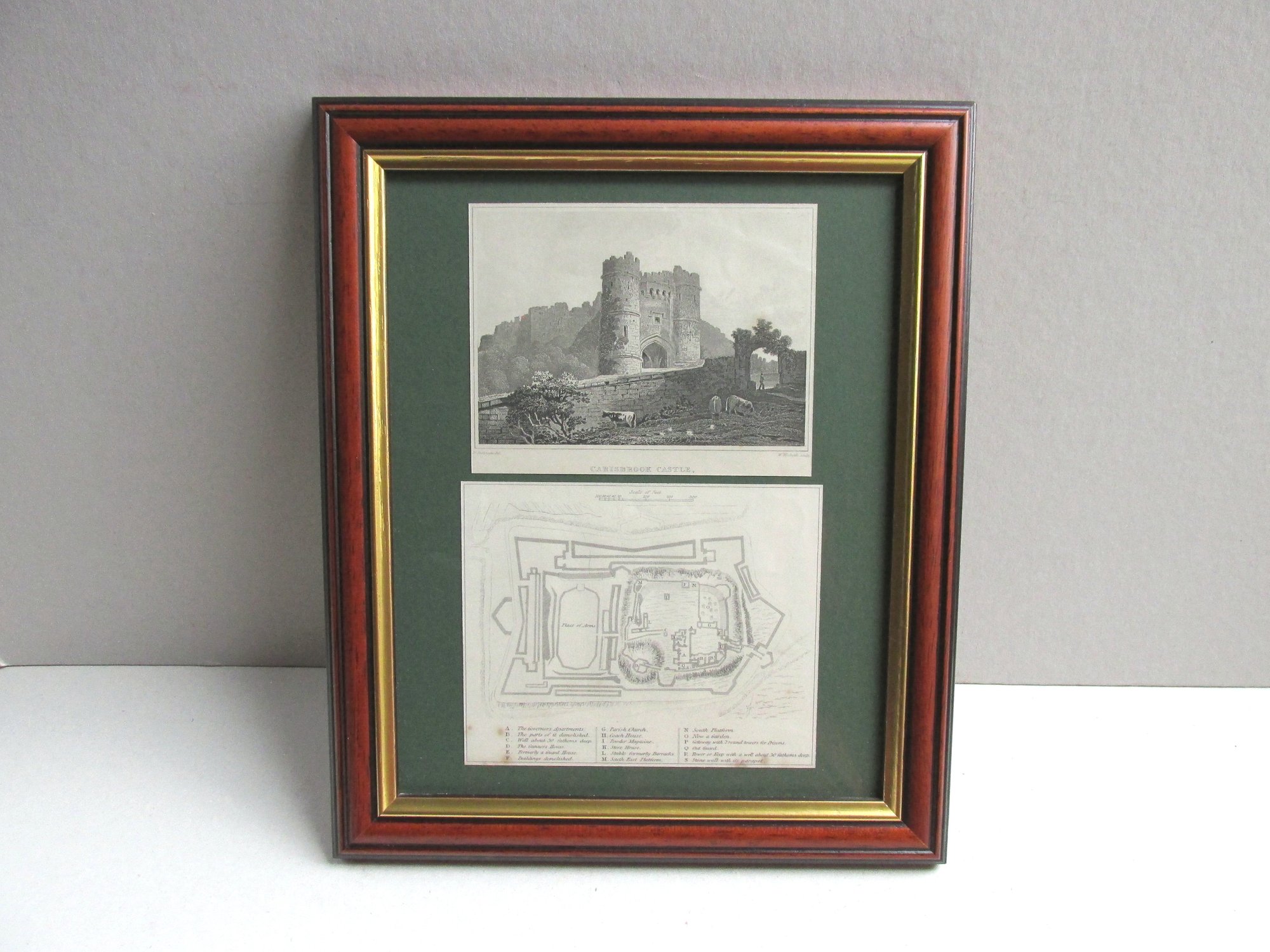 Size of prints only, including borders/titles: Castle scenery approx 5 2/10 x 4 1/10 inches, 13.2cm x 10.4cm. Castle plan approx 5 1/2 x 4 1/2 inches, 14cm x 11.3cm.