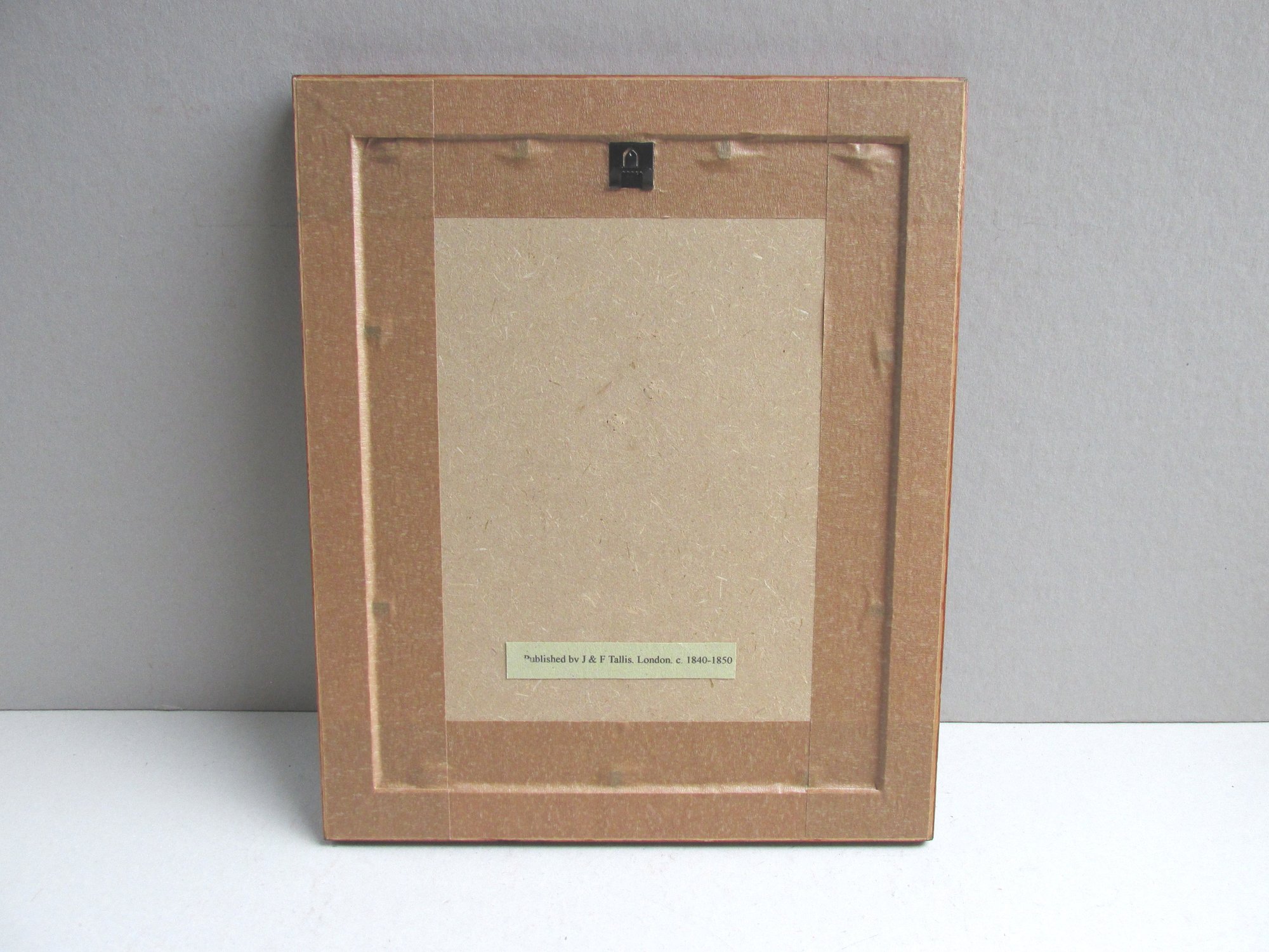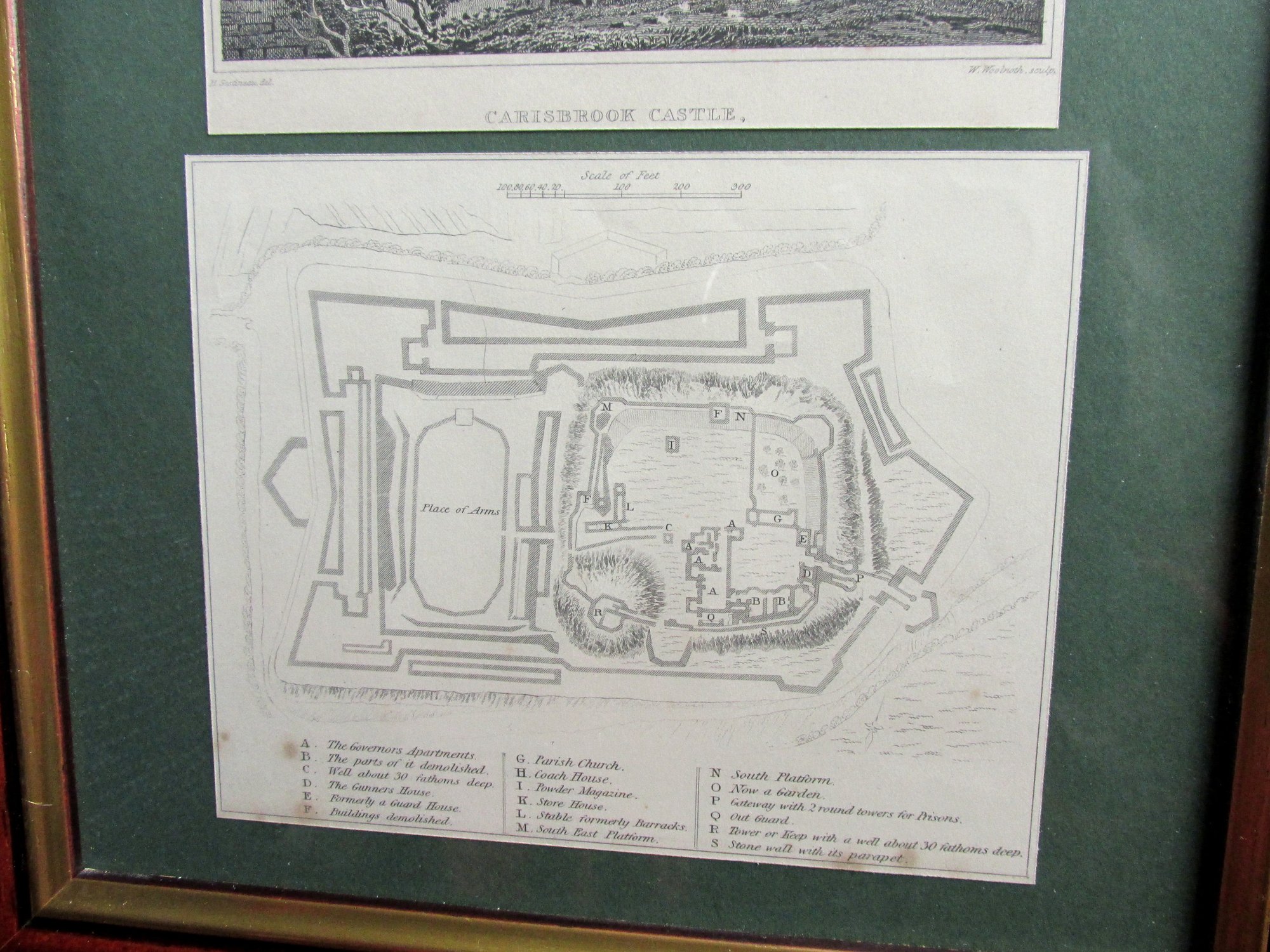 One print depicts a castle frontage with wall and gate to the foreground, cattle and a farmer. Small integral border with title 'Carisbrooke Castle' and artist/engraver's names H. Gastineau and W. Woolnoth. The other print is a bird's eye view diagram plan, to scale, of the castle with parts named along the bottom of the print. Fascinating pictures. Label on back of frame states 'Published by J & F Tallis. London c. 1840-1850'.