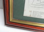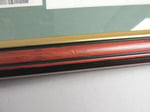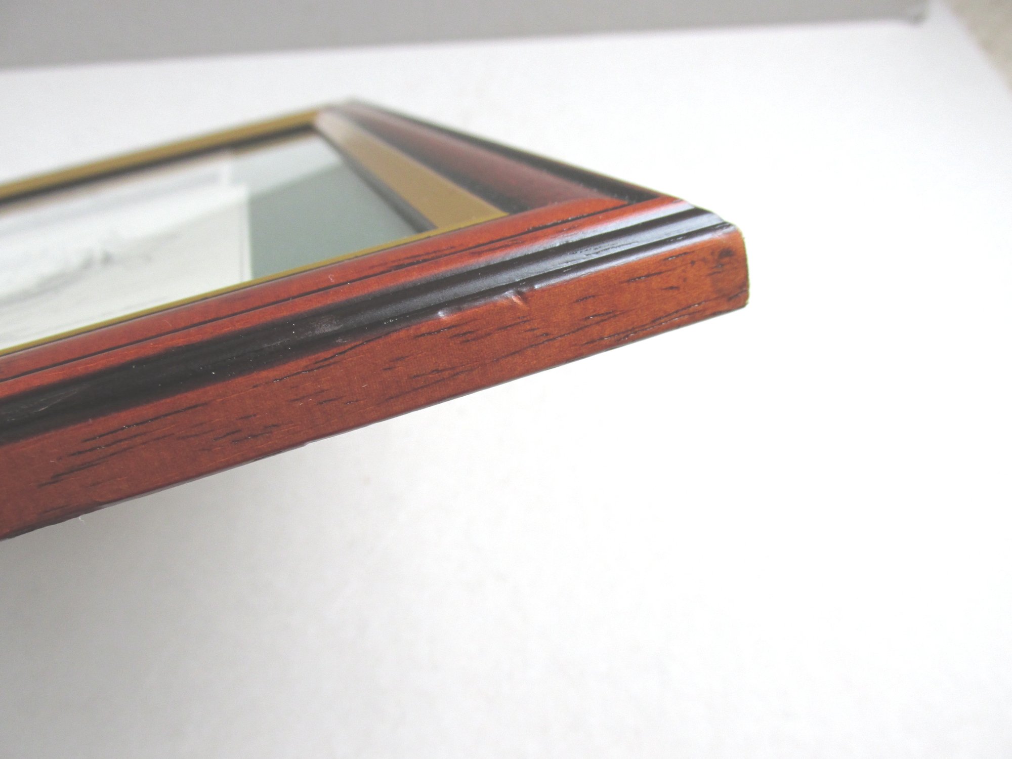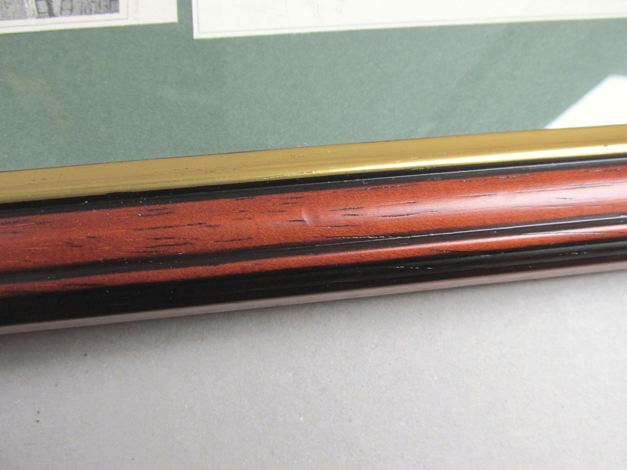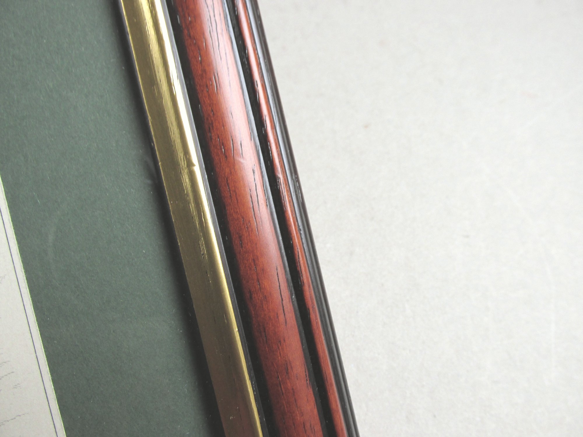 Prints mounted on muted darkish green board. Moulded wooden frame edges in rich brown colour with fine grain markings, very dark brown moulding lines, and gold colour inner edges. Glass to front. Hardboard back on frame with tabbed and taped edges. Metal tab for hanging. Some of the rear fittings are newer.