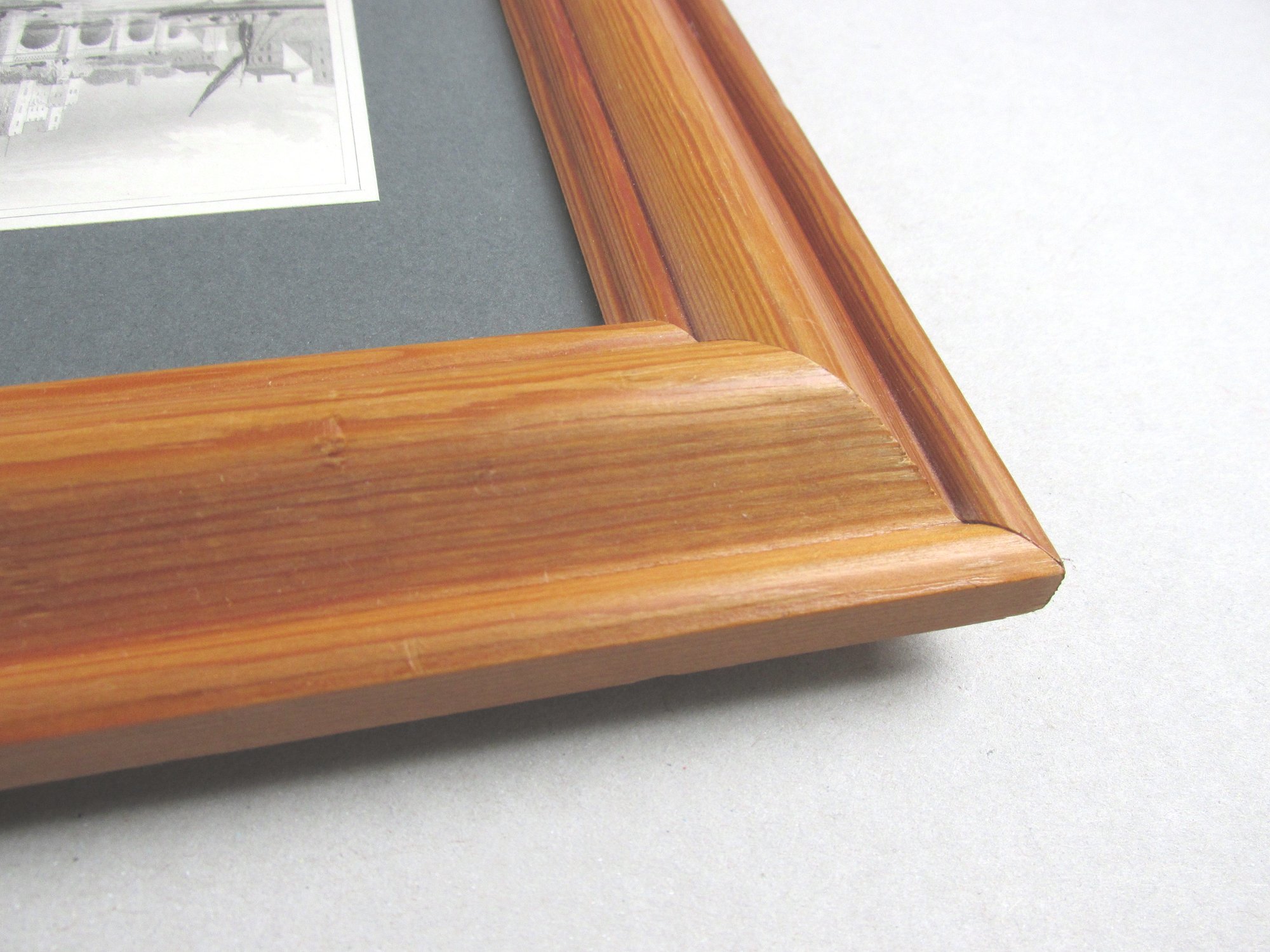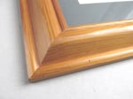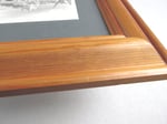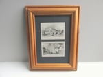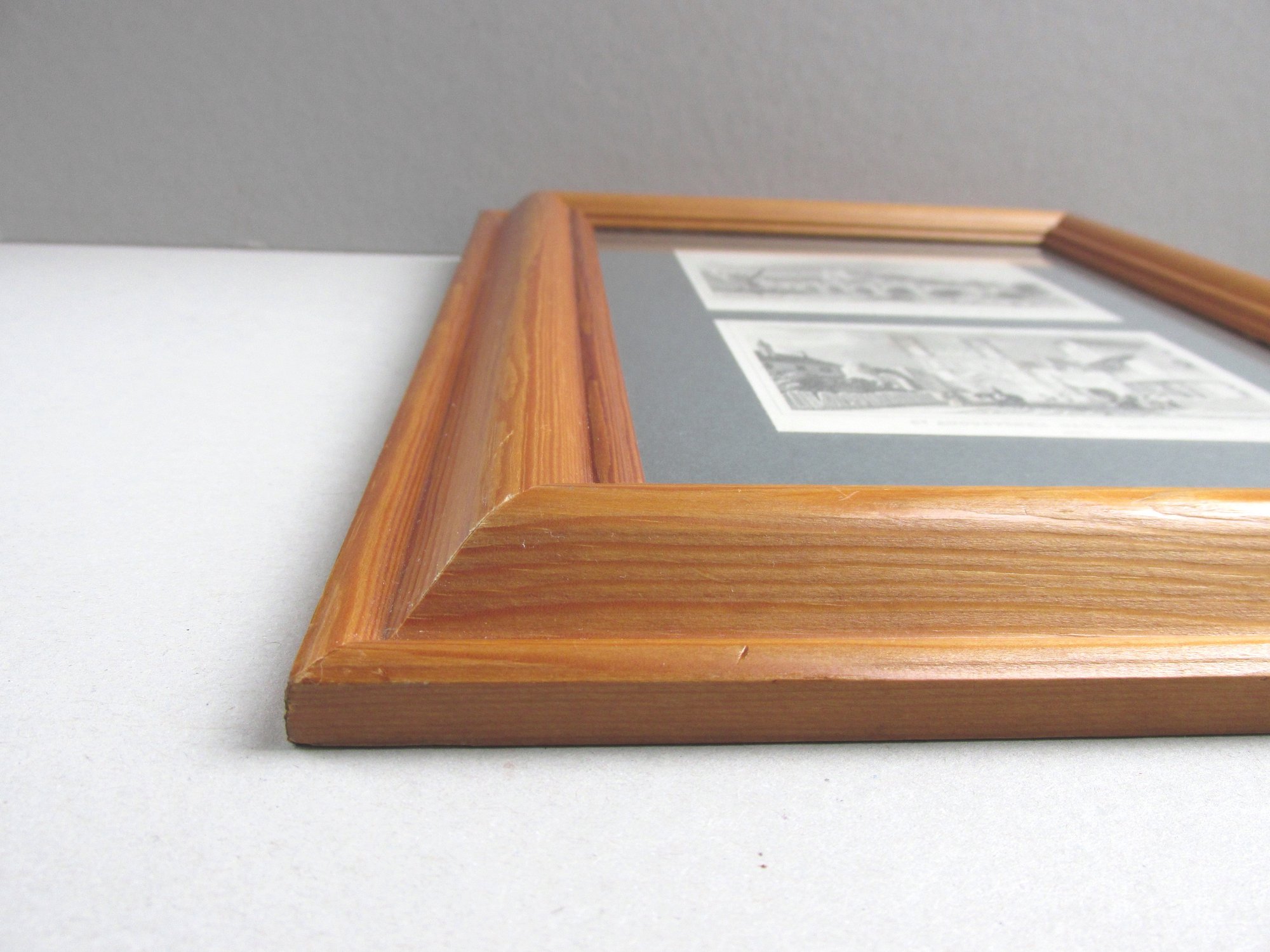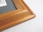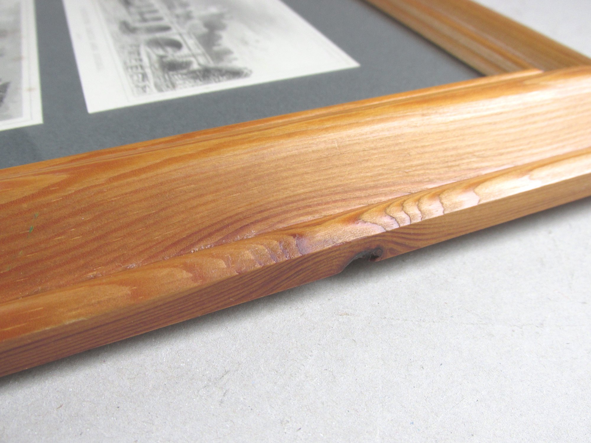 Prints mounted on grey board. Chunky moulded wooden frame edges in light to mid warm brown, with nice grain and a light sheen finish. Glass to front. Hardboard back on frame with tabbed and taped edges. Metal eyes, with wire for hanging. Some of the rear fittings are newer.