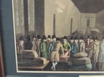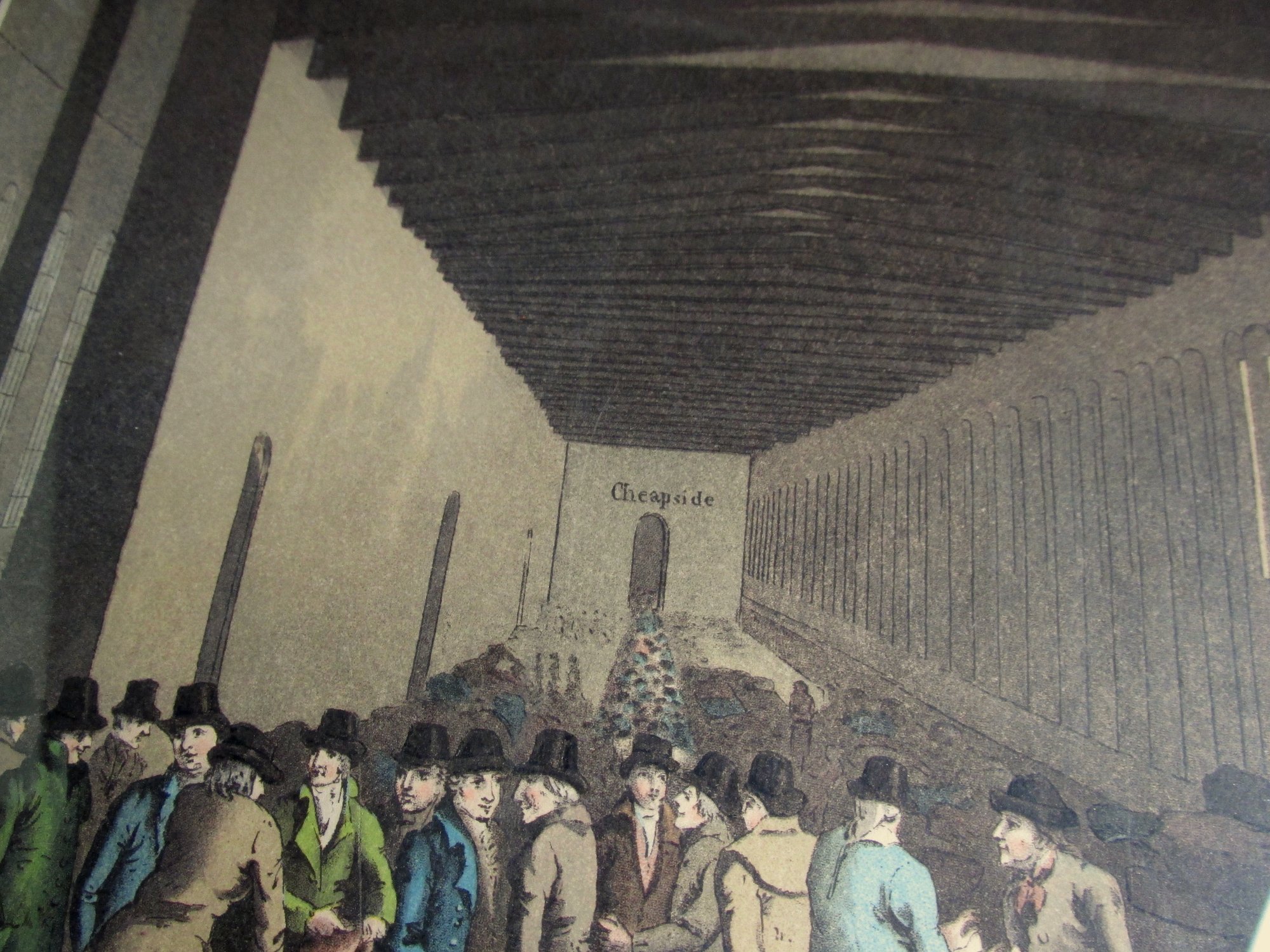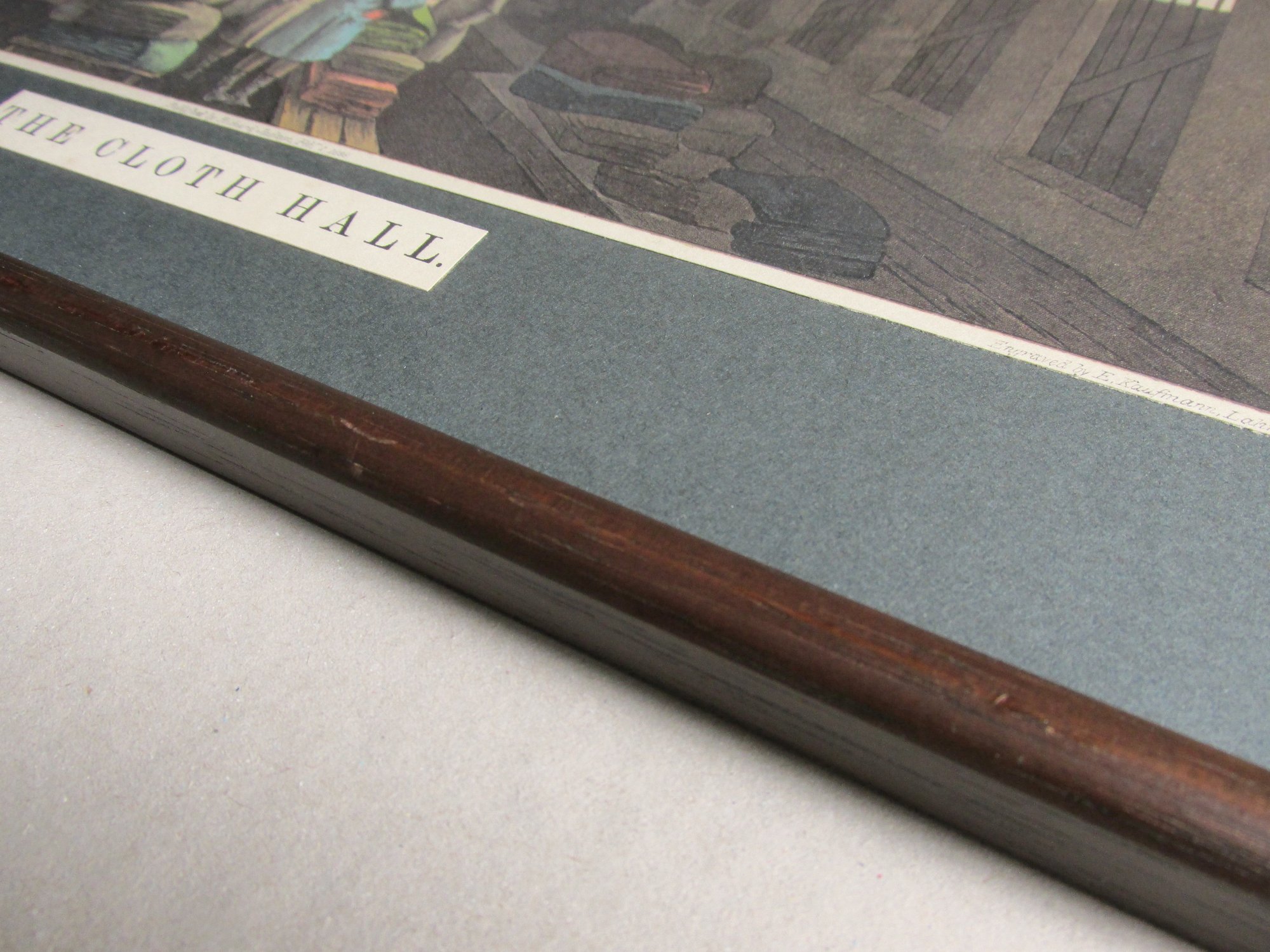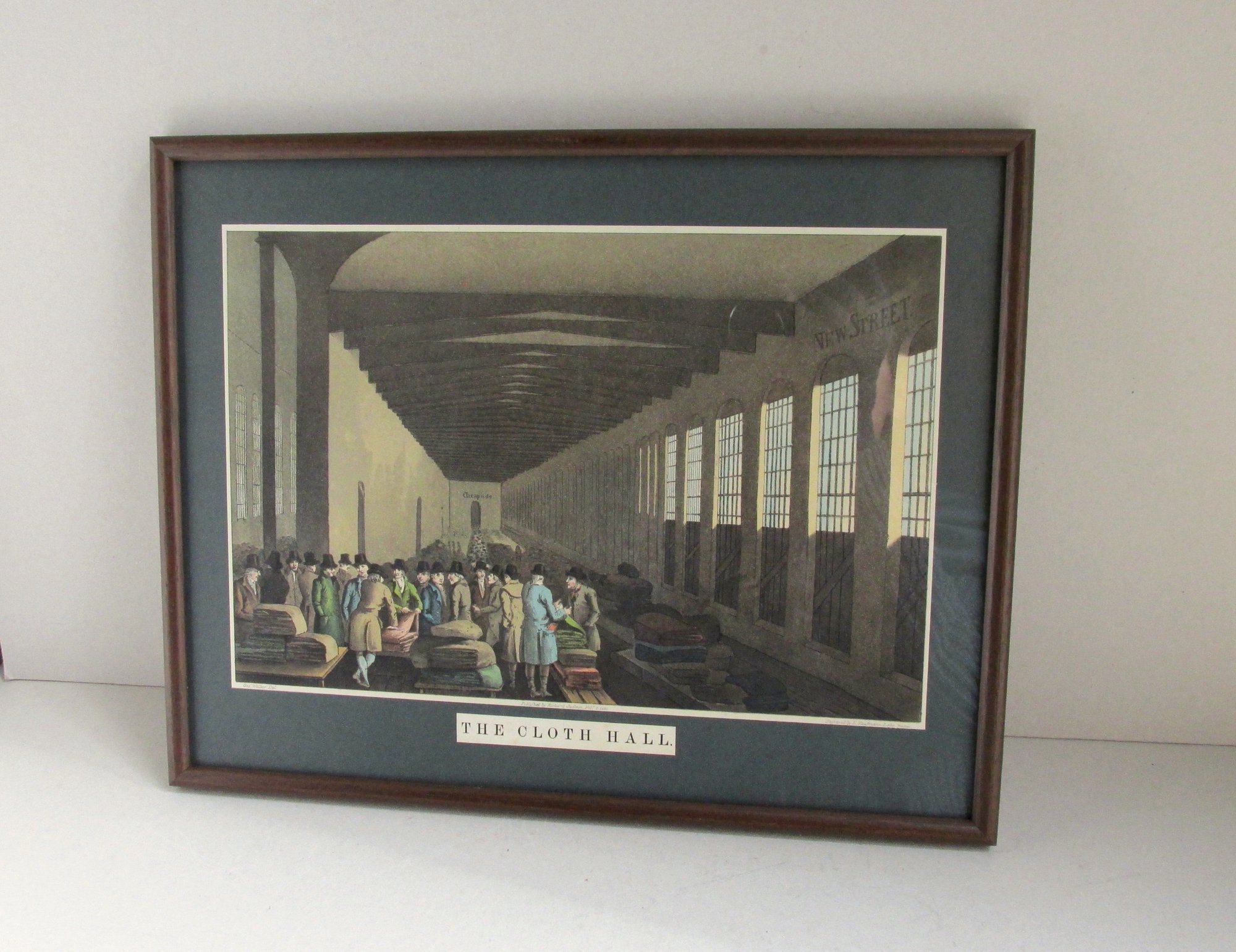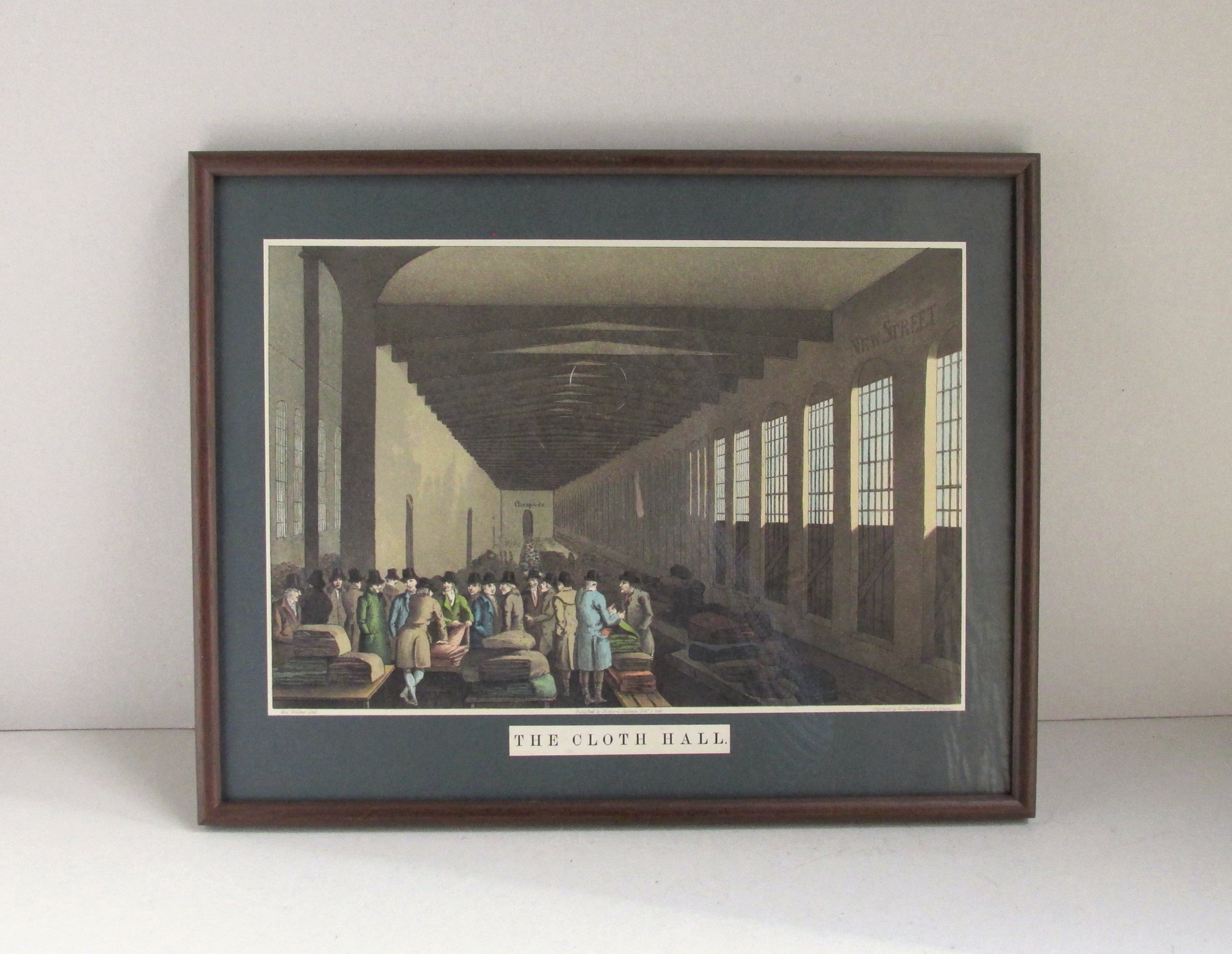 The interior if a merchants' hall, with gentlemen in a group, talking and looking at bundles of material. Tall windows and a beamed ceiling. The names 'New Street' and 'Cheapside' are on the walls. Narrow white border has printed names 'Geo. Walker Del., Published by Richard Jackson, Feb 1st, 1855, Engraved by E. Kaufmann, Lahr, Baden.' Separate original printed title label under the print states 'The Cloth Hall'.