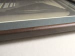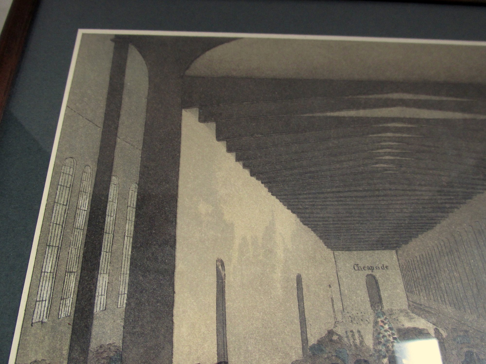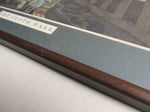 Print and title mounted on top of slate grey board. Simple narrow wooden frame edges in dark brown. Glass to front. Hardboard back on frame with tabbed and taped edges. Metal eyes and rings, with cord for hanging. Some of the rear fittings are newer.