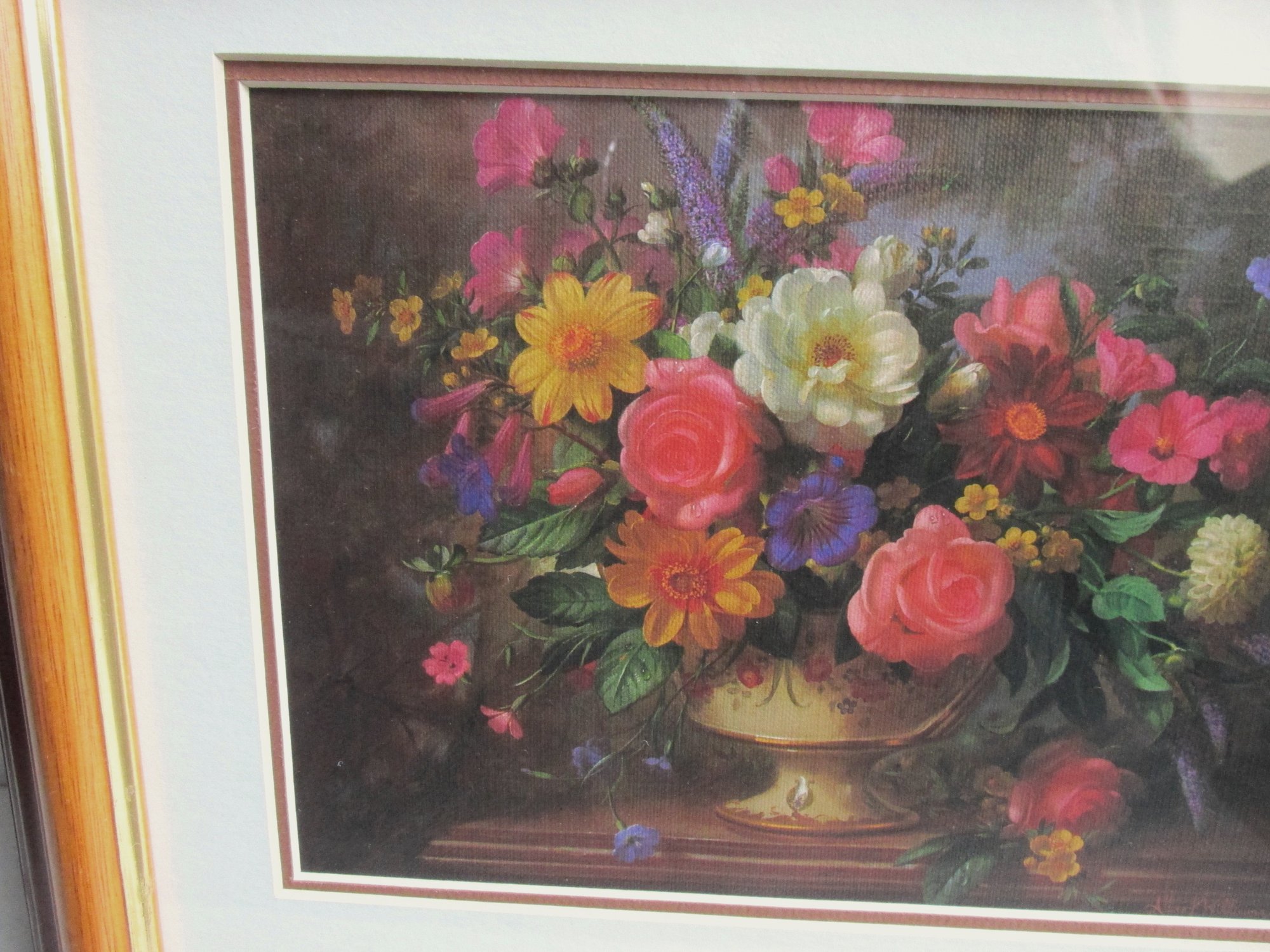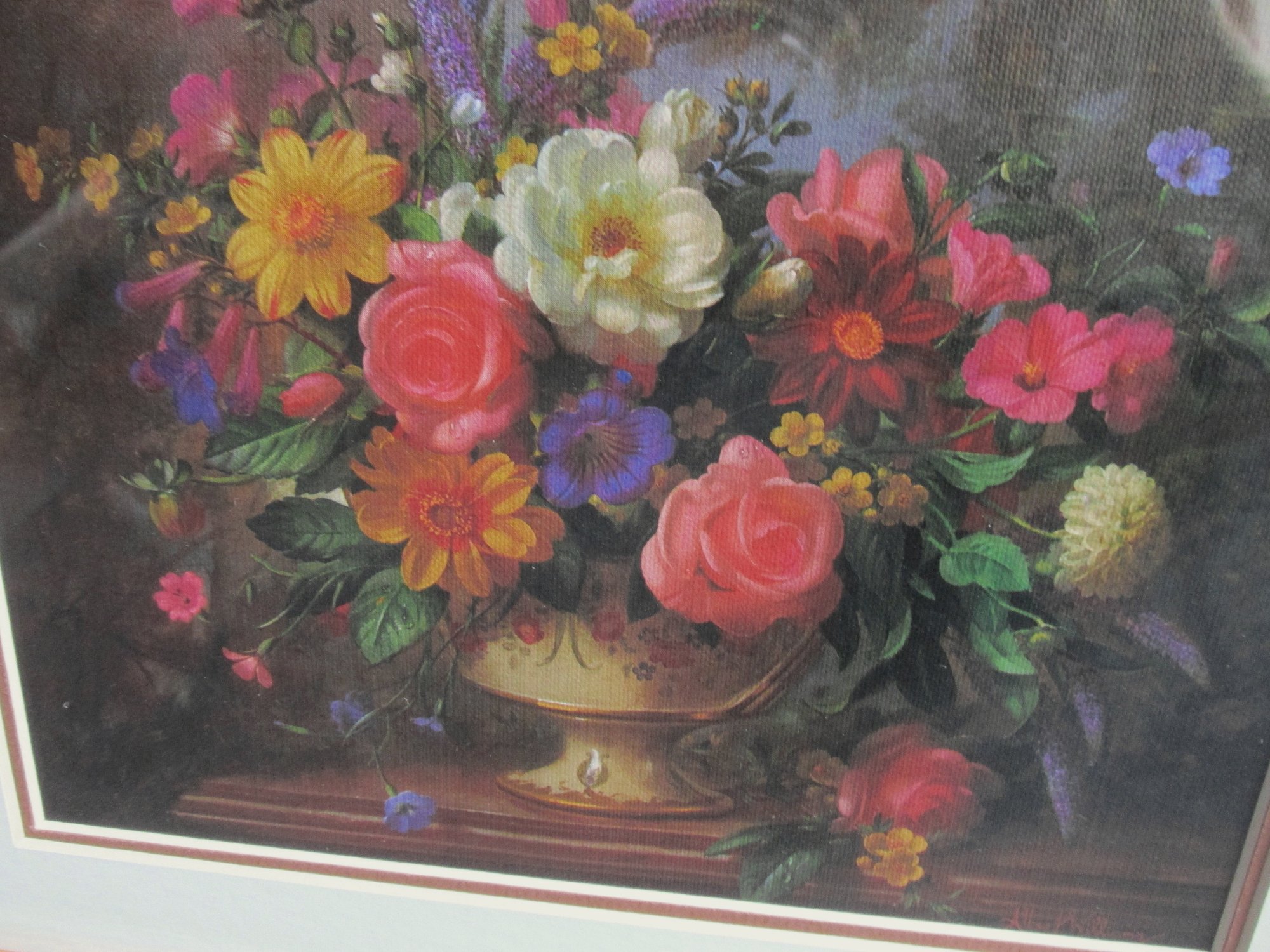 Depicting a bunch of various colour flowers, including pink roses, in a vase on a table. Printed signature to corner of print 'Albert Williams'.