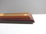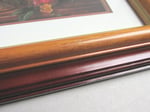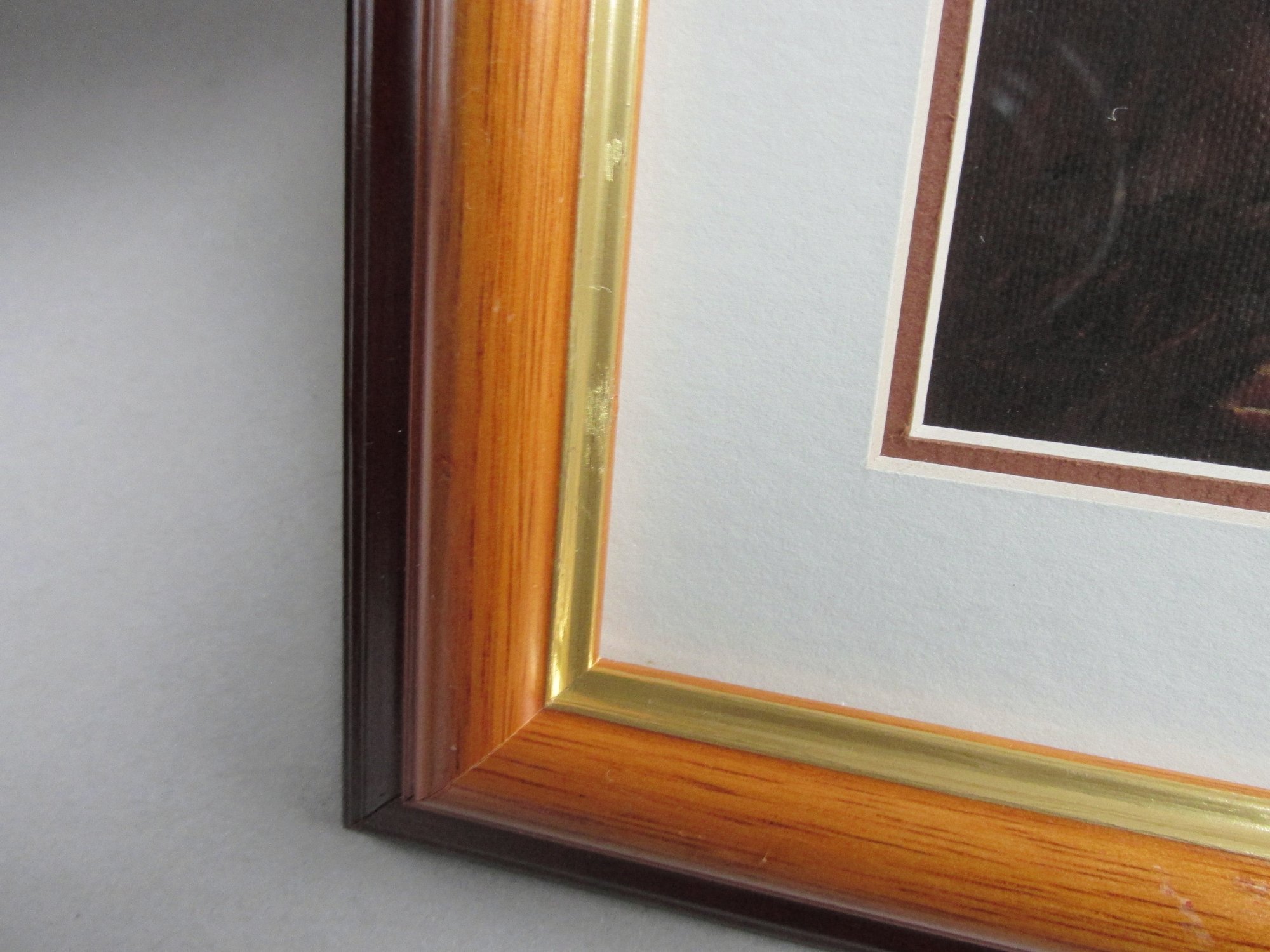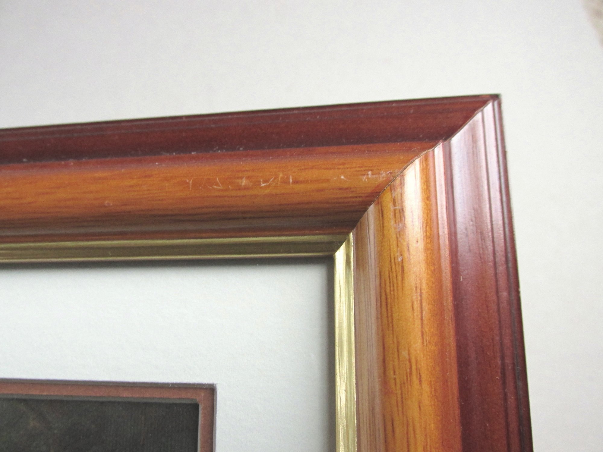 Frame Details: Double board overlay mounts (cream colour main mount, and brown inner edge mount). Moulded wooden frame edges, brown colours with a hint of yellow-orange and fine grain, and gold colour inner edges. Glass to front. Hardboard back on frame with strut for standing, metal fixing for hanging, and newly tabbed and taped edges.
