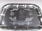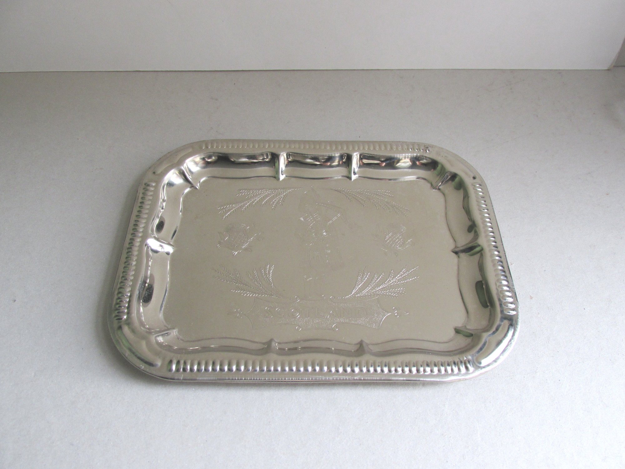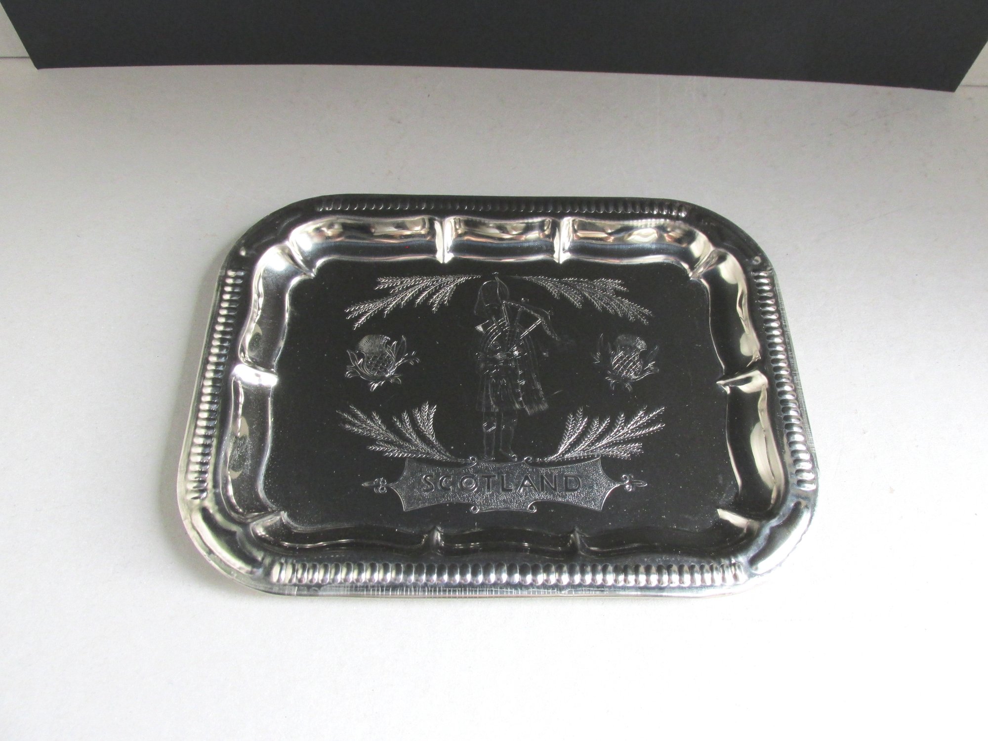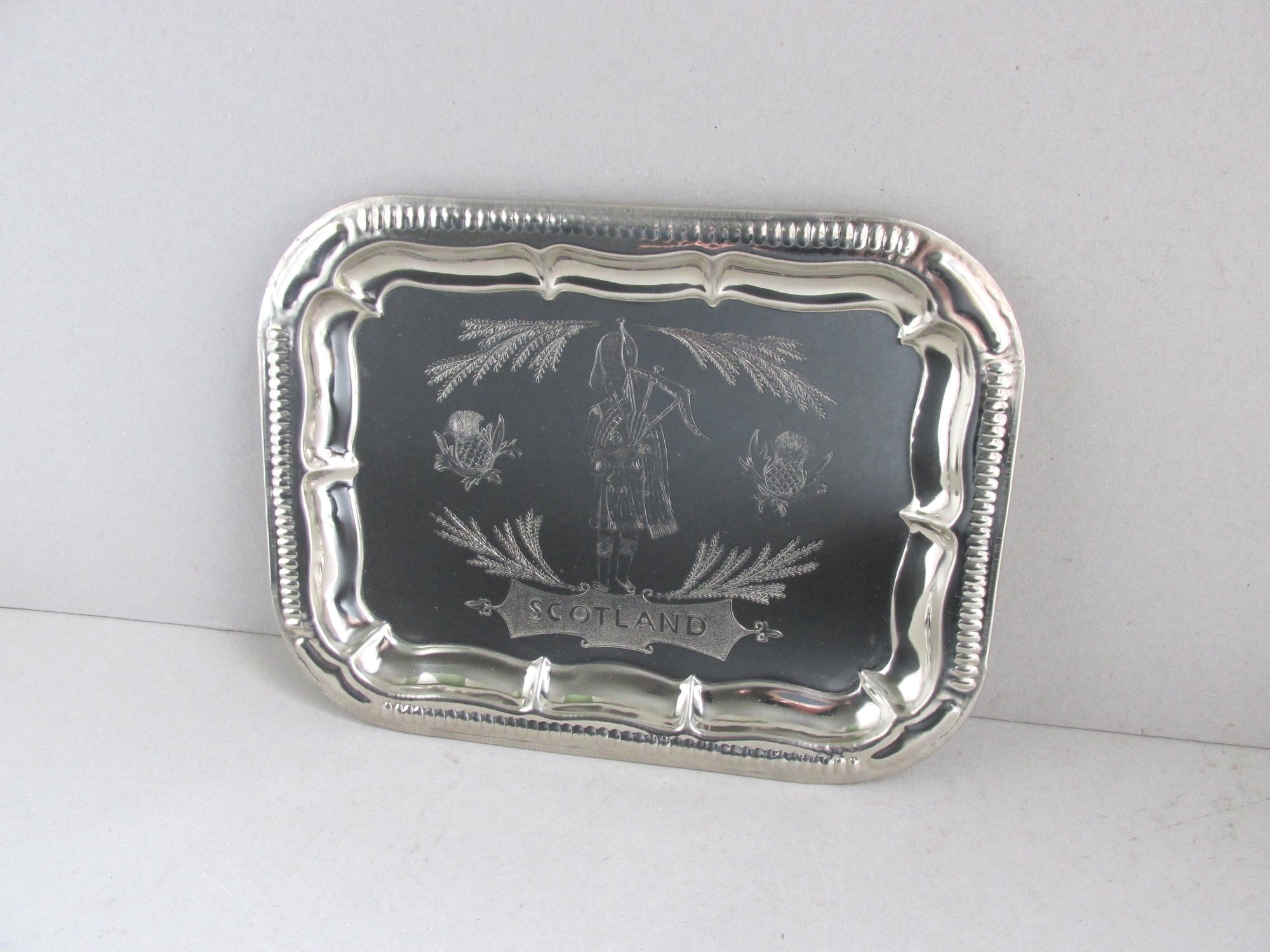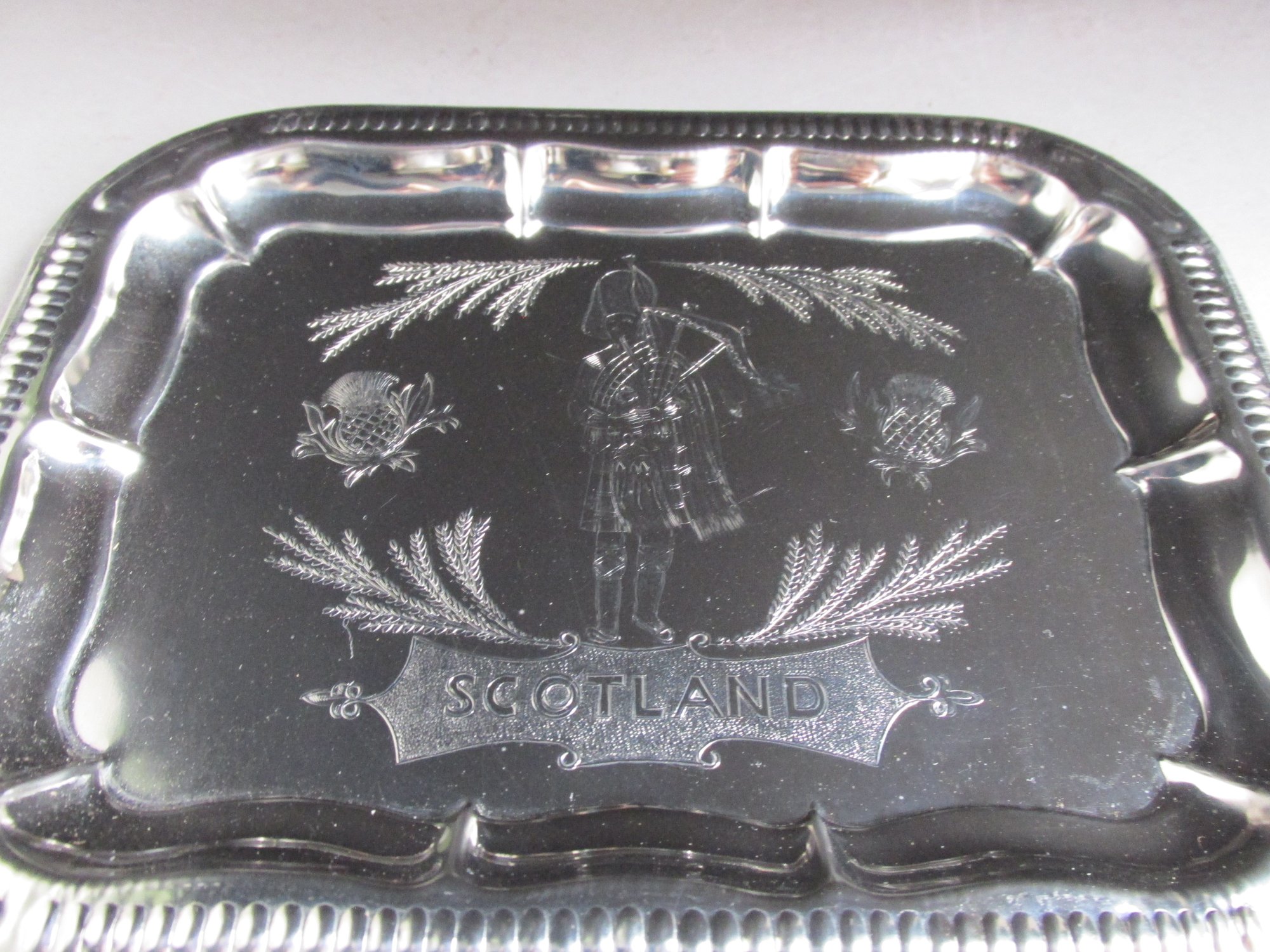 The tray is made of thin silver colour metal, rectangular shape with rounded corners, moulded and shaped patterns to edges, and a finely textured design the the centre depicting a bagpipe player, thistles and heather, and the name 'Scotland' in a cartouche.