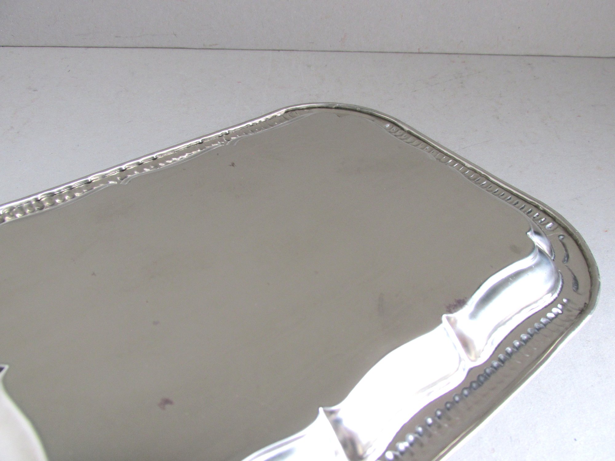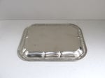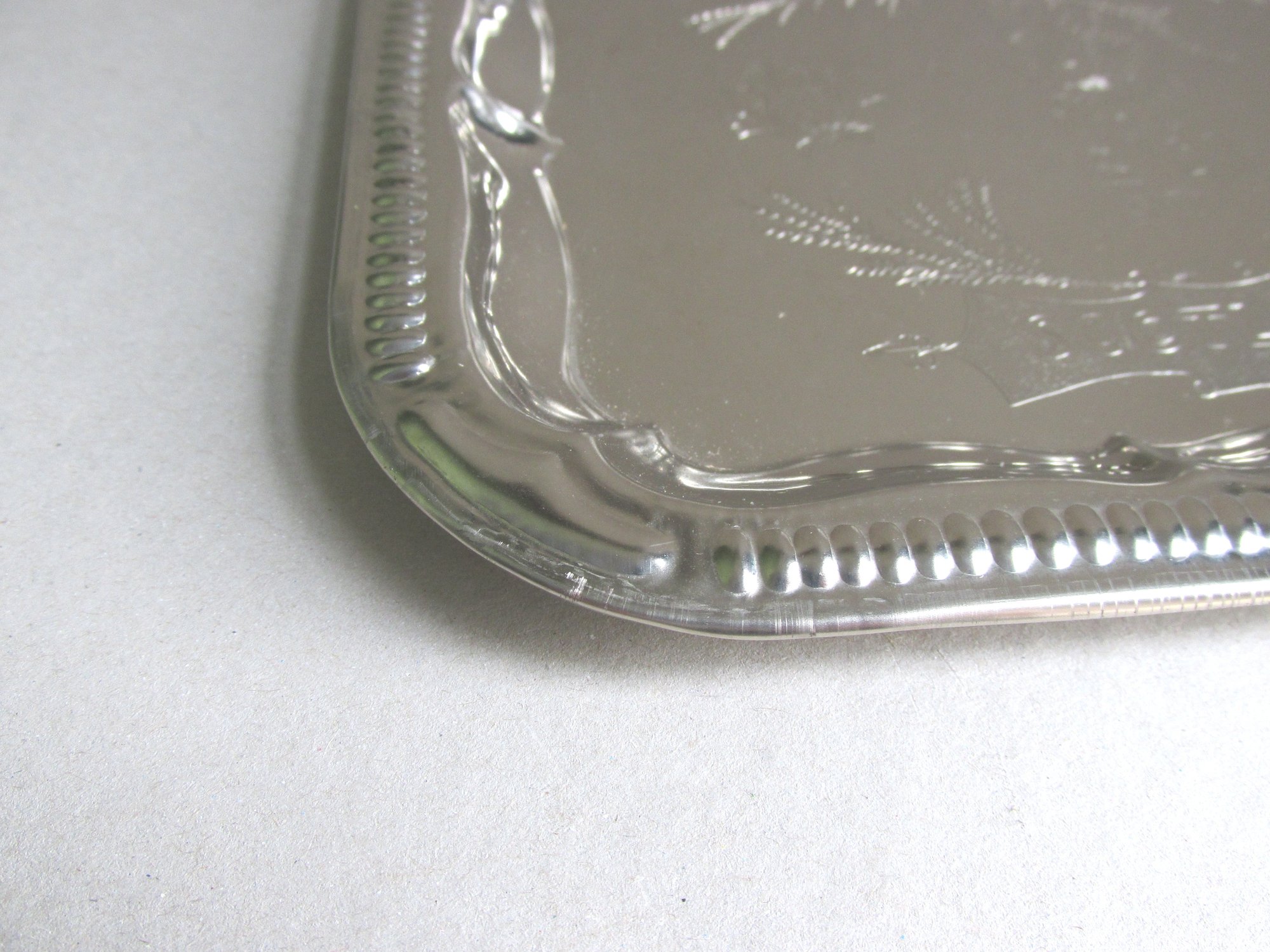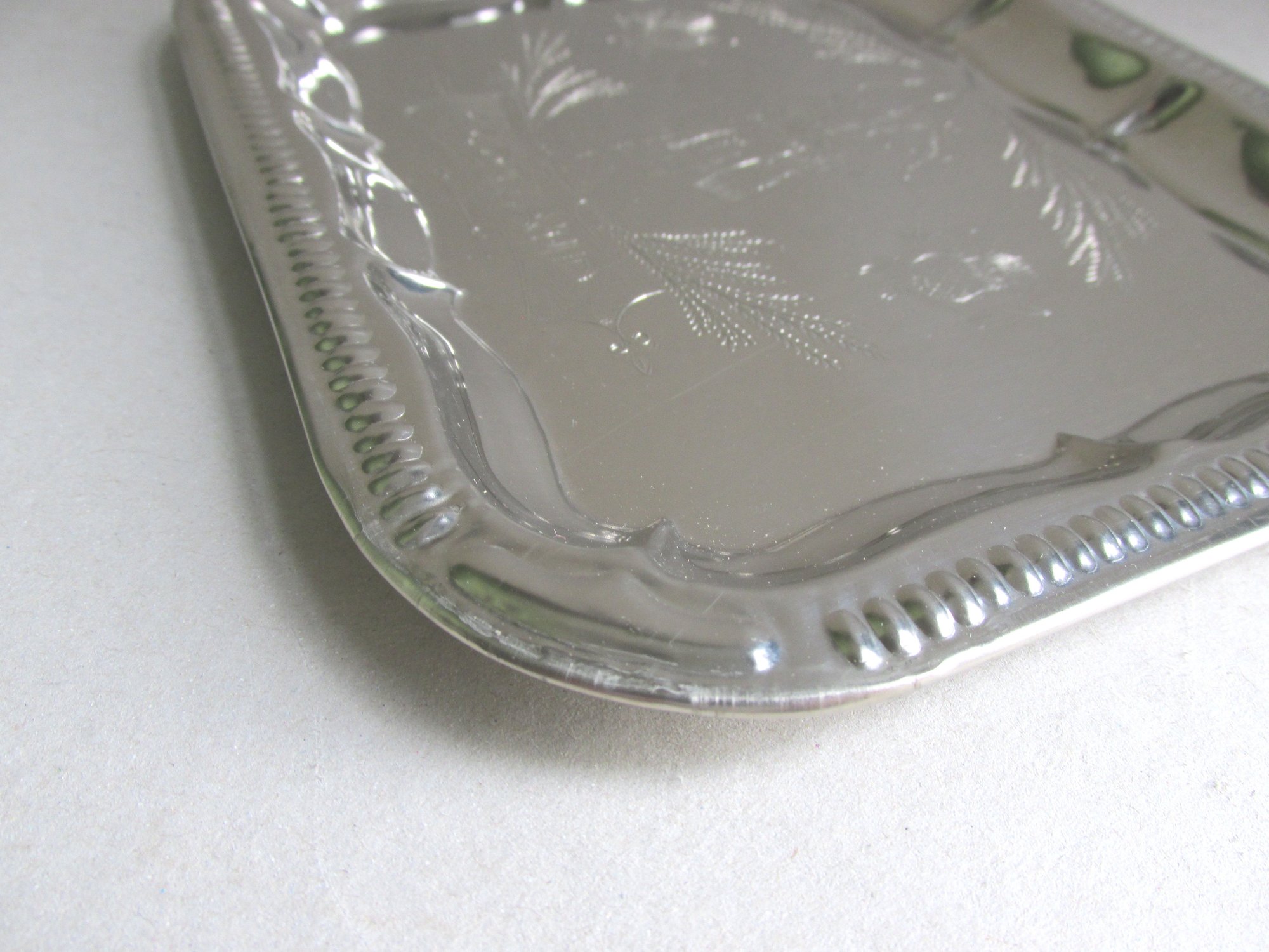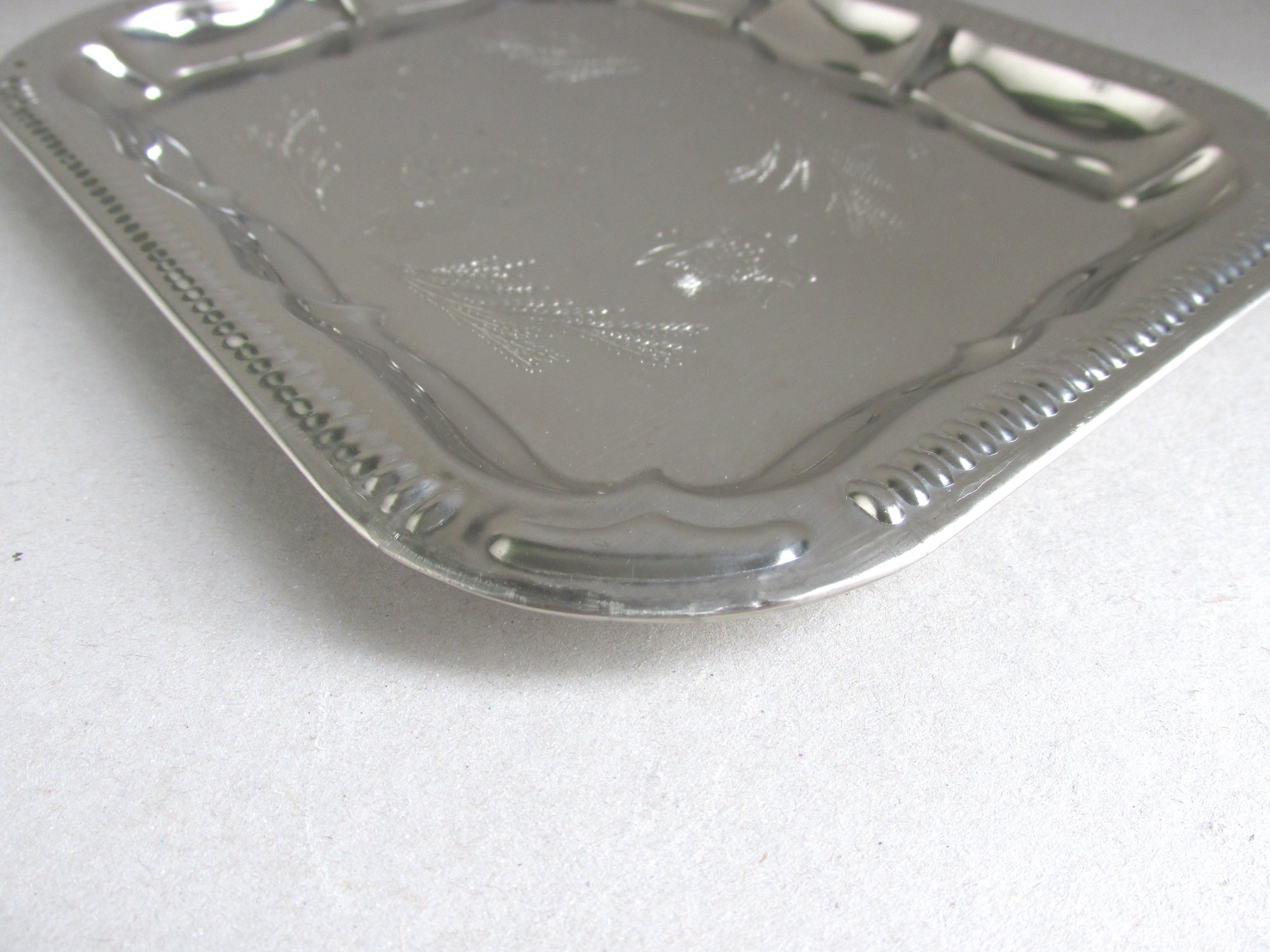 The tray is made of thin silver colour metal, rectangular shape with rounded corners, moulded and shaped patterns to edges, and a finely textured design the the centre depicting a bagpipe player, thistles and heather, and the name 'Scotland' in a cartouche.