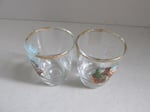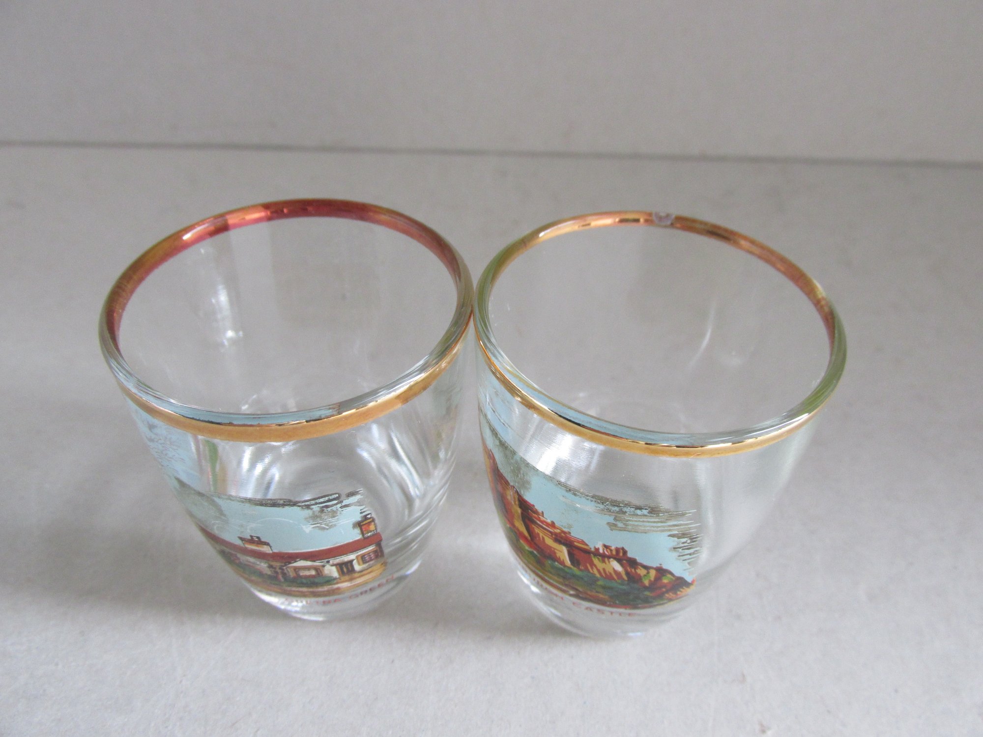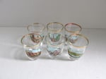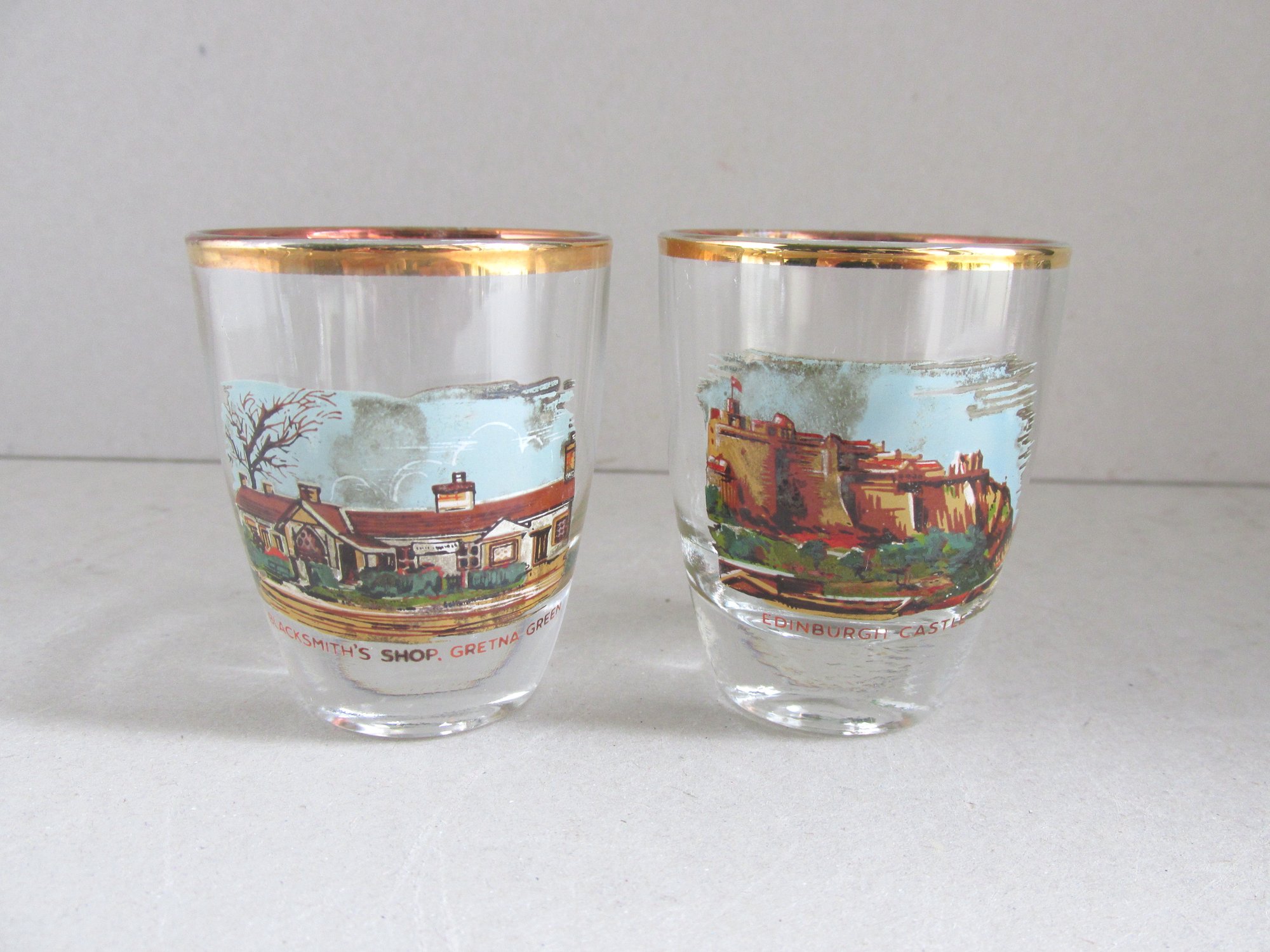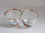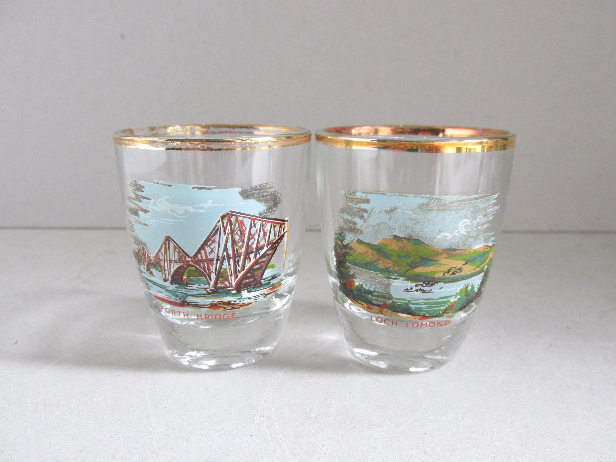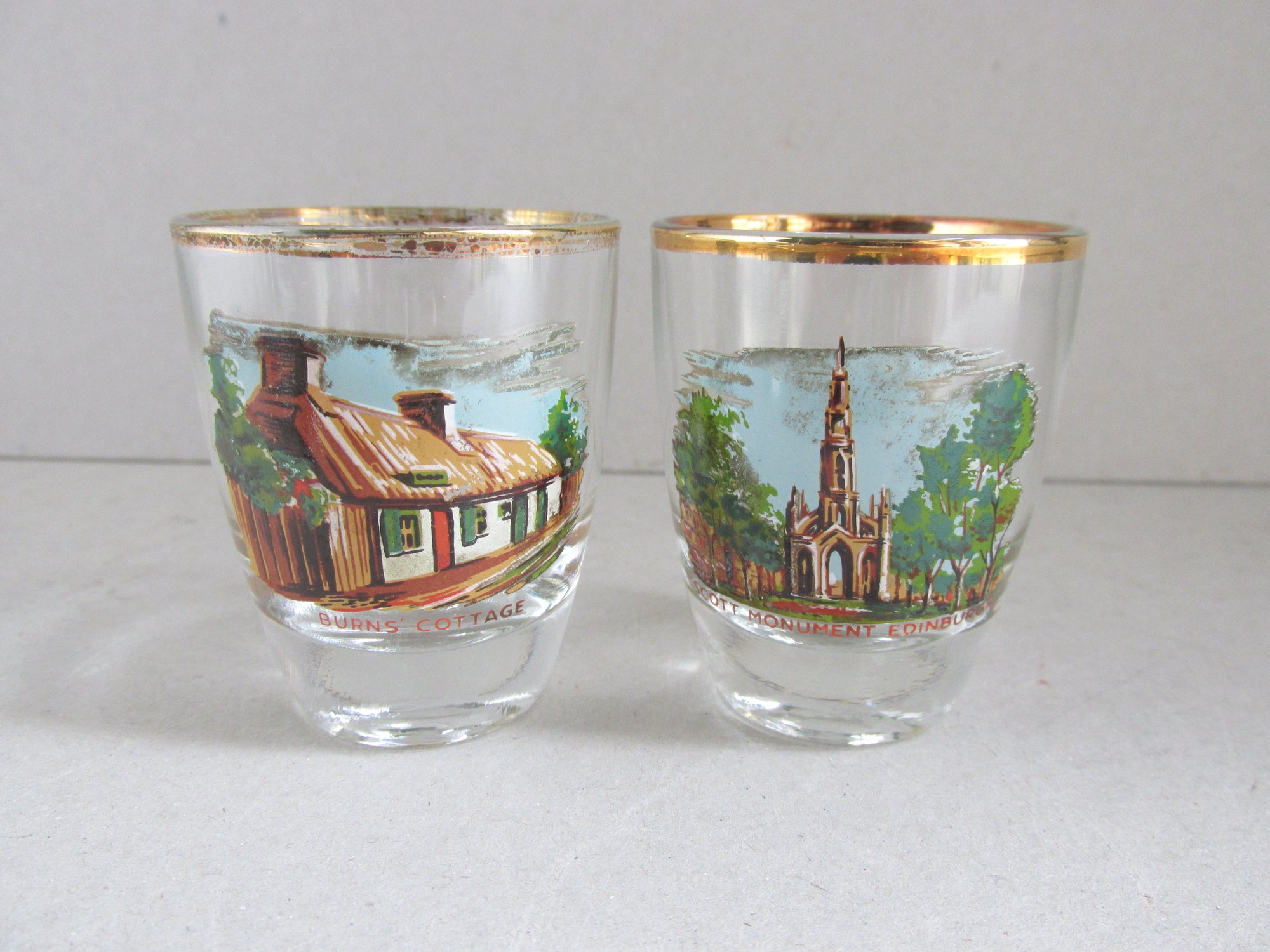 Clear glass with gold colour top rim, and a colour transfer illustration to front of each glass depicting: Burn's Cottage, Forth Bridge, Blacksmith's Shop in Gretna Green, Edinburgh Castle, Loch Lomond and Scott Monument in Edinburgh.