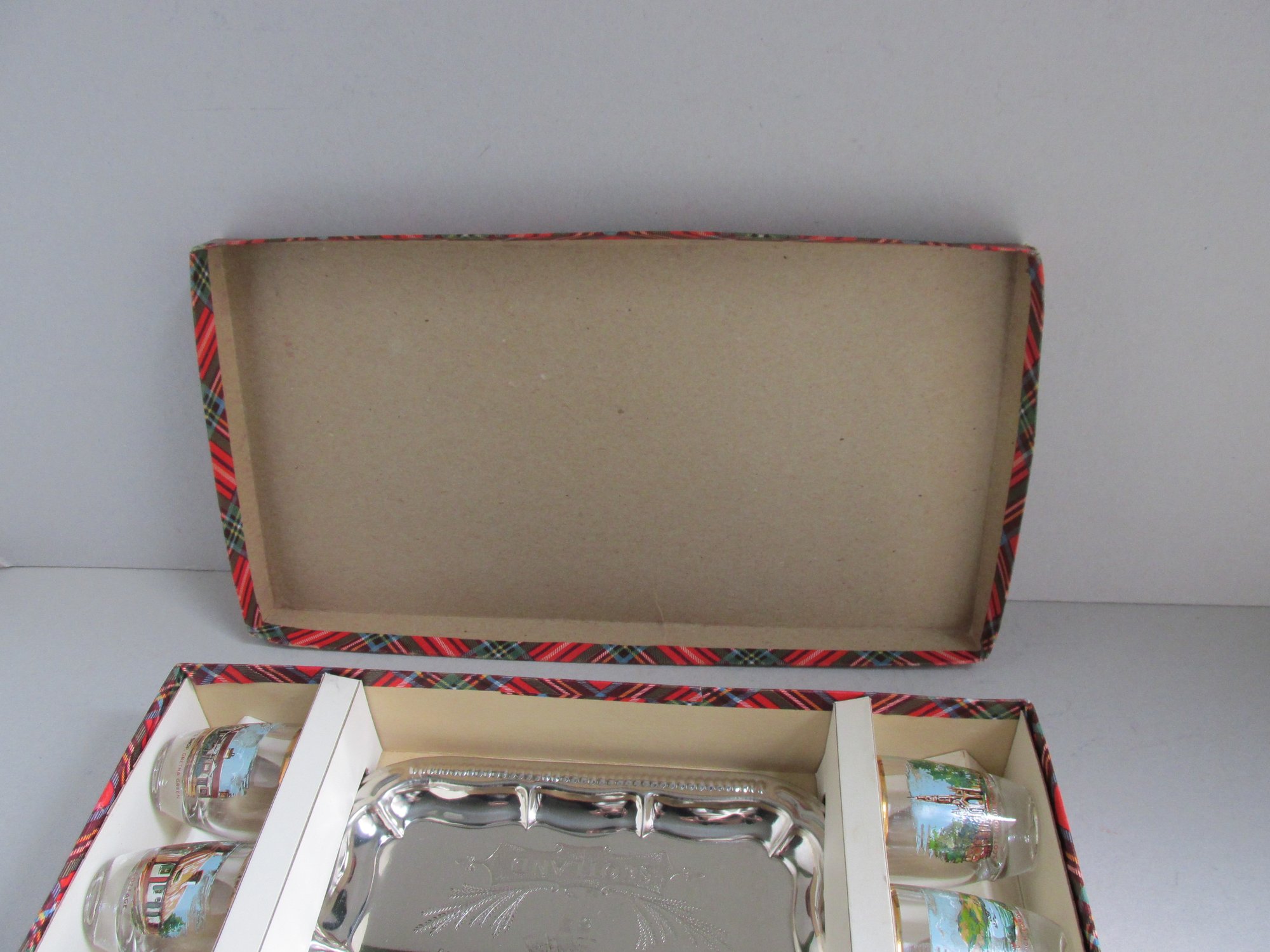 Vintage Scotland Shot Glasses Set (6) with Metal Tray, c 1960s, Boxed