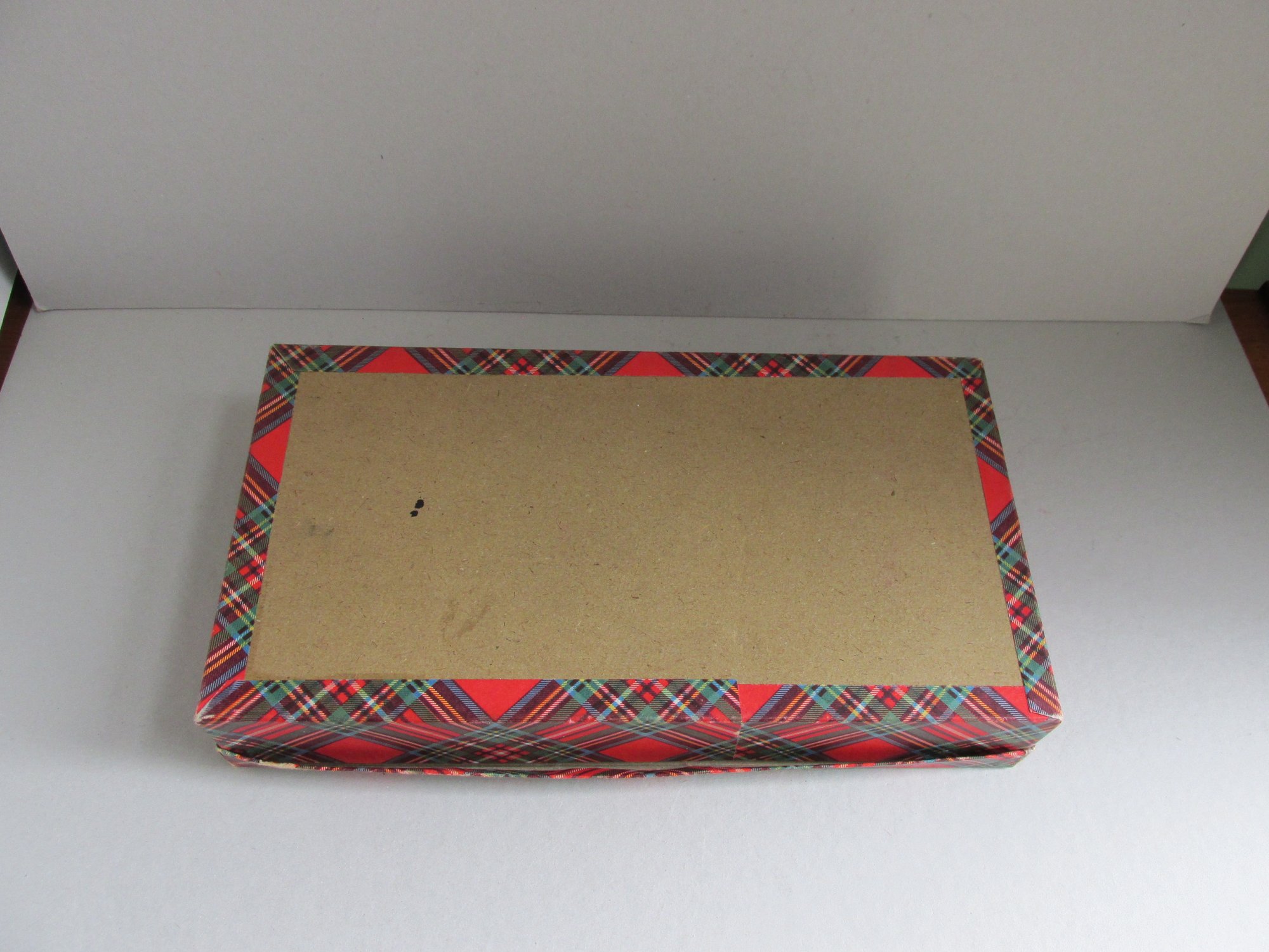 Card box with tartan pattern to exterior top and sides.